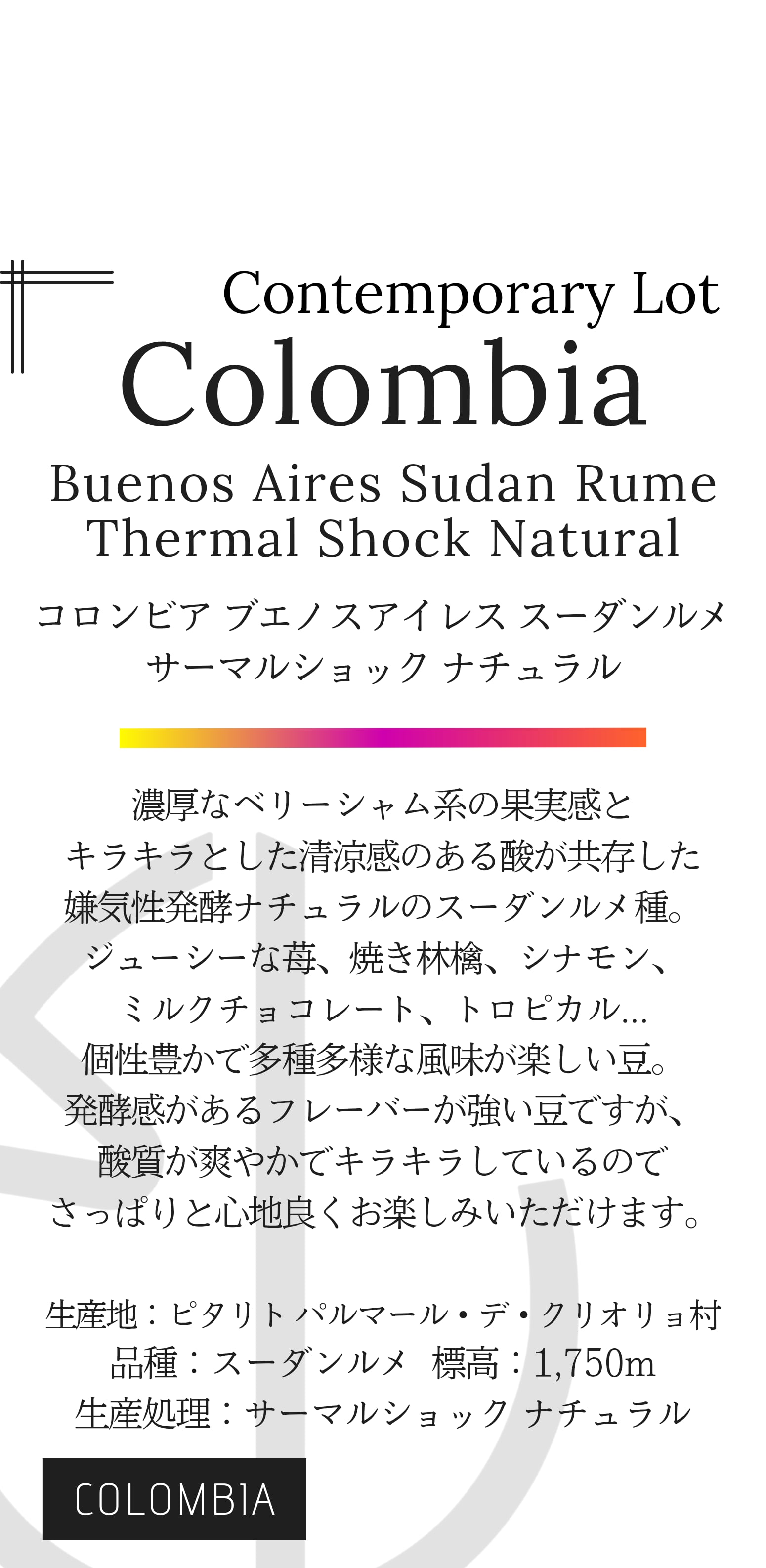 【コロンビア ブエノスアイレス農園 スーダンルメ種 サーマルショック・ナチュラル 】